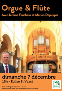 Cette année, l’orgue invite un complice inédit : la flûte. Tous deux instruments à vent et proches par nature, ils uniront leurs sonorités dans un répertoire éclectique, imaginé par l’organiste Jérôme Faucheur et la flûtiste Marion Depuyper. Une rencontre prometteuse, entre puissance et légèreté. Au programme des œuvres de Bach, de Debussy, de Mozart, de Fauré ou encore d’Haendel… Avec Jérôme Faucheur (orgue) et Marion Depuyper (flûte) Jérôme Faucheur est l’organiste de l’église Saint-Vaast de Bondues depuis 55 ans et poursuit une carrière internationale. En mai 2026, il donnera quatre récitals à Londres dont un dans l’abbaye de Westminster. Marion Depuyper est flûtiste et enseigne à l’école municipale de Bondues Durée : 1h20 Tarifs : 10€/Gratuit pour les -18 ans