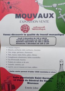 Venez découvrir la qualité du travail monastique • jeudi 4 décembre 14h à 18h30 • vendredi 5 décembre 10h à 18h30 • samedi 6 décembre 10h à 18h30 • dimanche 7 décembre 10h à 13h00 articles religieux, biscuit, confiserie, miel, confitures, chocolats, vins, spiritueux, chartreuses, thés, tisanes, huile d’olive, pâtés, rillettes, compléments alimentaires, huiles essentielles, eau d’émeraude, baumes, produits de toilette et de soin, vaisselle, vannerie, cuir, layette, sac et trousse en tissus, tablier. Cette vente permet d’aider 3500 moniales à vivre
